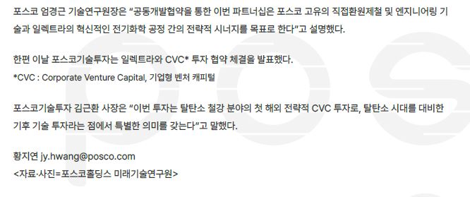 포스코, 저탄소 제철 기술 보유 미국 혁신기업 일렉트라사와 기술 공동개발