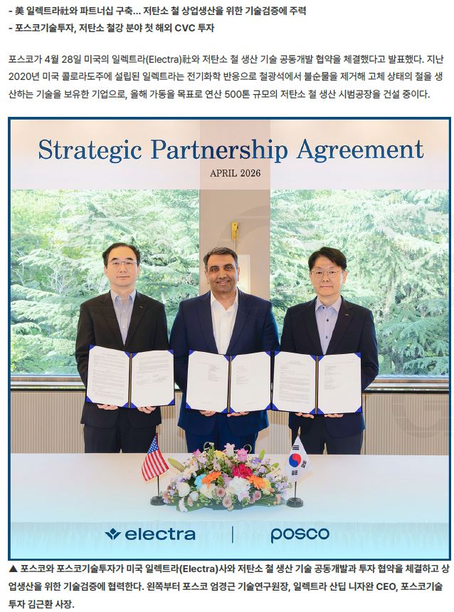 포스코, 저탄소 제철 기술 보유 미국 혁신기업 일렉트라사와 기술 공동개발